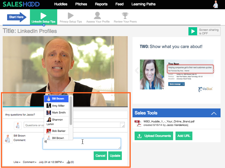 You can mention a person in the comment box by tagging the user within your scheduled huddle or pitch. The person will then receive an email notification with a link to where they were mentioned.